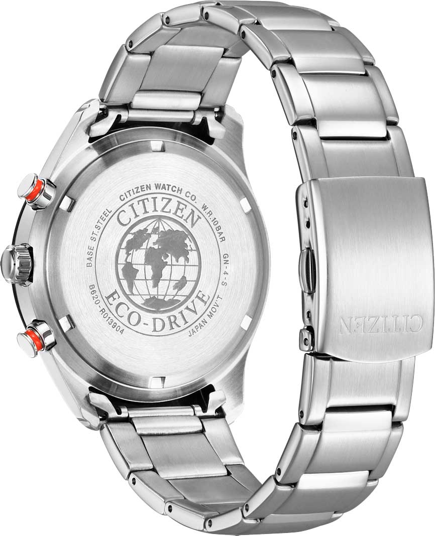 Сдержанный дизайн и расширенный функционал - безупречный выбор мужчин, знающих цену каждому мгновению. Eco-Drive. Система Eco-Drive, не требующая замены батарейки. Питание от солнечной энергии, запас энергии на 270 дней. Функция индикации заряда (EOL) и предотвращения перезарядки. Часы-хронограф с секундомером до 1ч и тахиметром. 12-ти и 24-х часовой формат времени. Циферблат с метками в виде штрихов выполнен по технологии Sunray (солнечные лучи). Окошко даты находится между отметками 4 и 5 часов. Браслет с раскладывающейся застежкой.