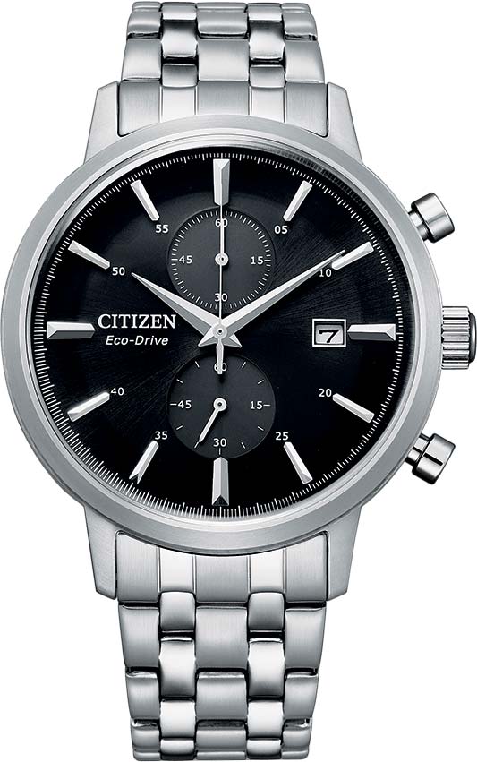 Система Eco-Drive не требующая замены батарейки. Питание от солнечной энергии, запас энергии на 210 дней. Функция индикации заряда (EOL). Часы-хронограф с секундомером. Часы-хронограф с секундомером. Секундомер с точностью 1/1сек и временем измерения 1ч. Секундная стрелка вынесена на отдельный циферблат. Метки в виде штрихов. Окошко даты. Браслет с раскладывающейся застежкой.