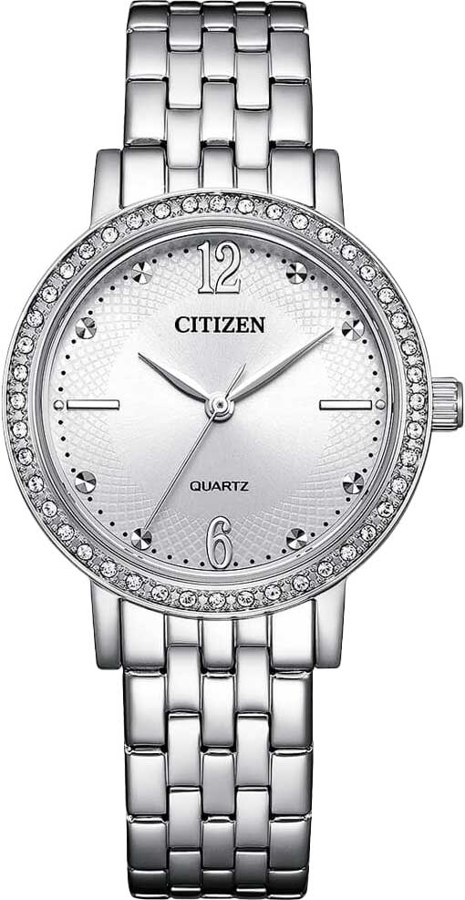 Женские часы. Циферблат выполнен по технологии Sunray (солнечные лучи). Метки в виде точек, двух штрихов и двух арабских цифр. Рифленая заводная головка. Браслет с раскладывающейся застежкой.