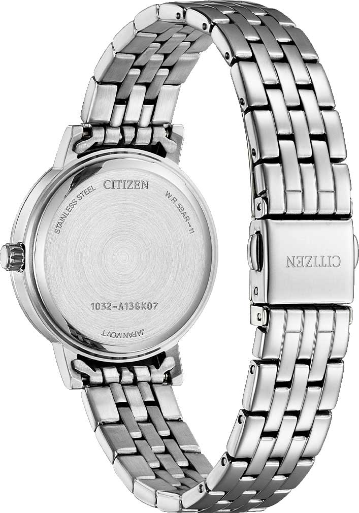 Женские часы. Перламутровый циферблат защищен минеральным стеклом. Метки в виде точек, штрихов и арабской цифры 12. Рифленая заводная головка. Браслет с раскладывающейся застежкой.