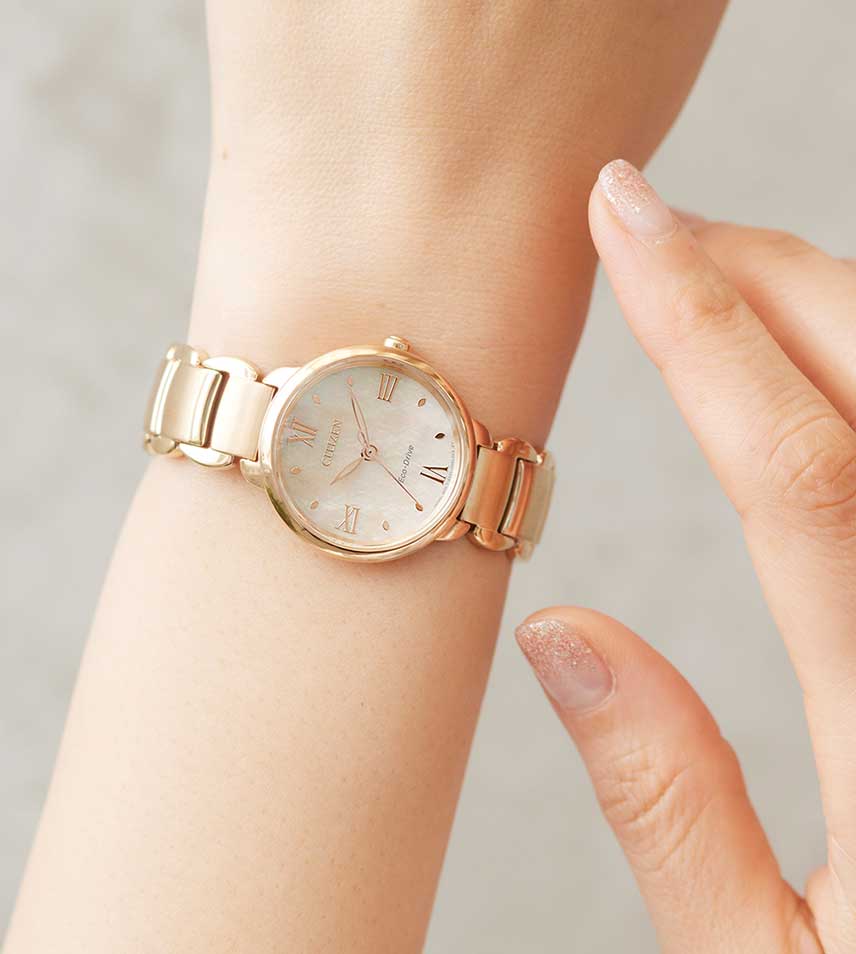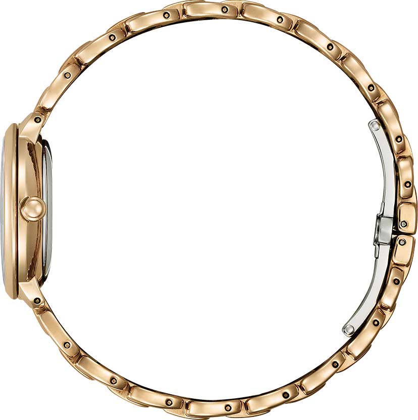 Citizen L. Система Eco-Drive, не требующая замены батарейки. Питание от солнечной энергии, запас энергии на 180 дней. Функция индикации заряда (EOL) и предотвращения перезарядки. Перламутровый циферблат защищен прочным сапфировым стеклом. Метки в виде штрихов и римских цифр. Браслет с раскладывающейся застежкой.