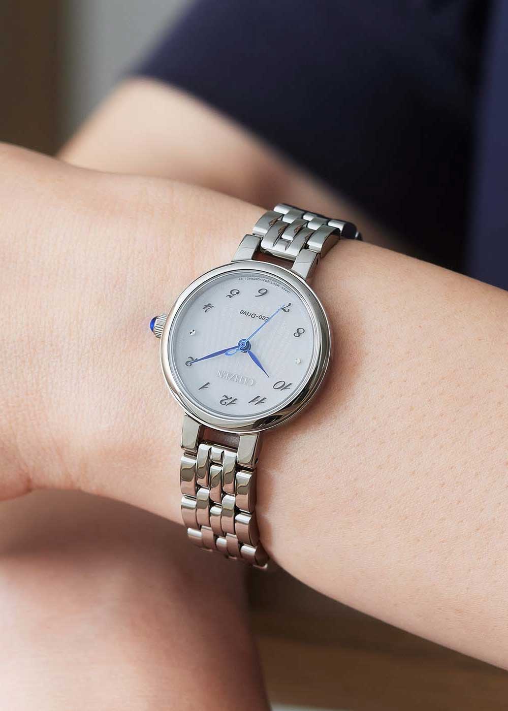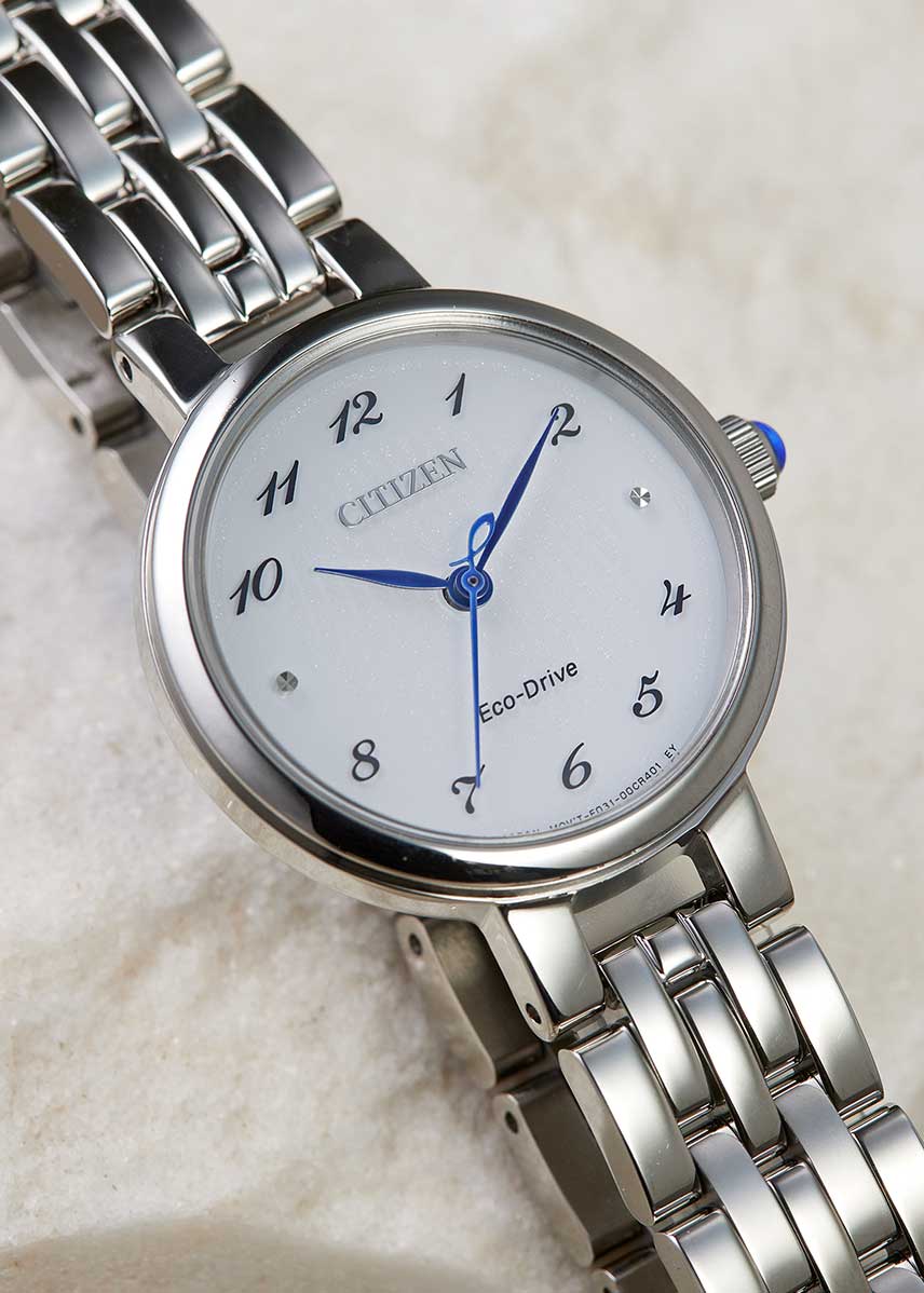Женские часы. Система Eco-Drive, не требующая замены батарейки. Питание от солнечной энергии, запас энергии на 180 дней. Функция индикации заряда (EOL) и предотвращения перезарядки.