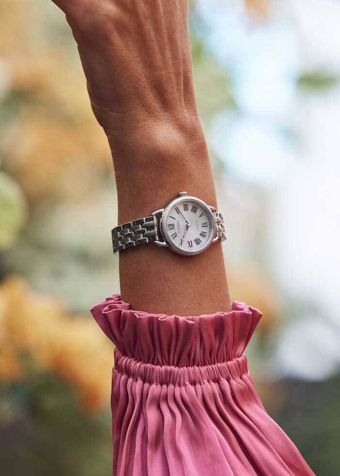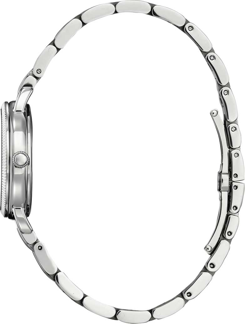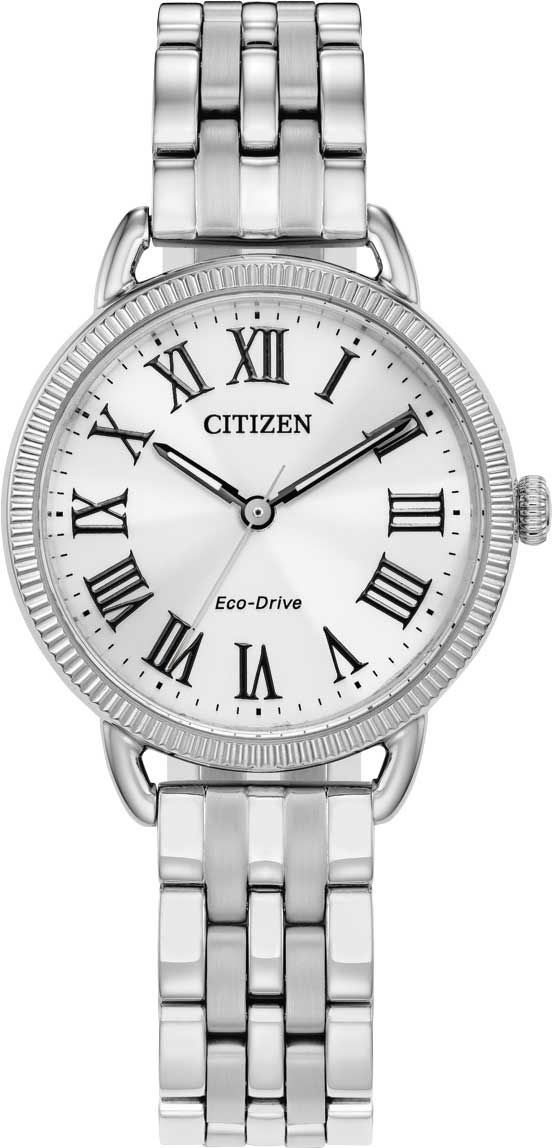 Женские часы. Система Eco-Drive, не требующая замены батарейки. Питание от солнечной энергии, запас энергии на 180 дней. Функция индикации заряда (EOL) и предотвращения перезарядки. Циферблат с метками в виде римских цифр выполнен по технологии Sunray (солнечные лучи). Браслет с раскладывающейся застежкой.