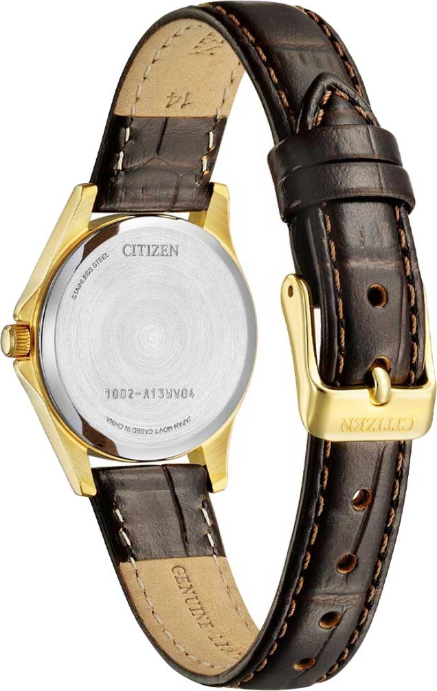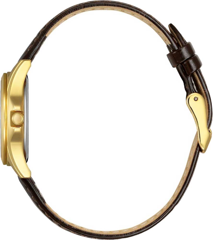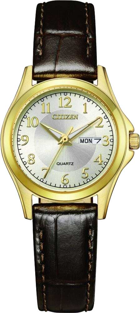 Женские часы с круглым стальным корпусом. Циферблат выполнен по технологии Sunray (солнечные лучи) и защищен минеральным стеклом. Метки в виде арабских цифр. Окошко даты и дня недели находится в положении 3 часа. Заводная головка с защитой. Браслет с раскладывающейся застежкой.