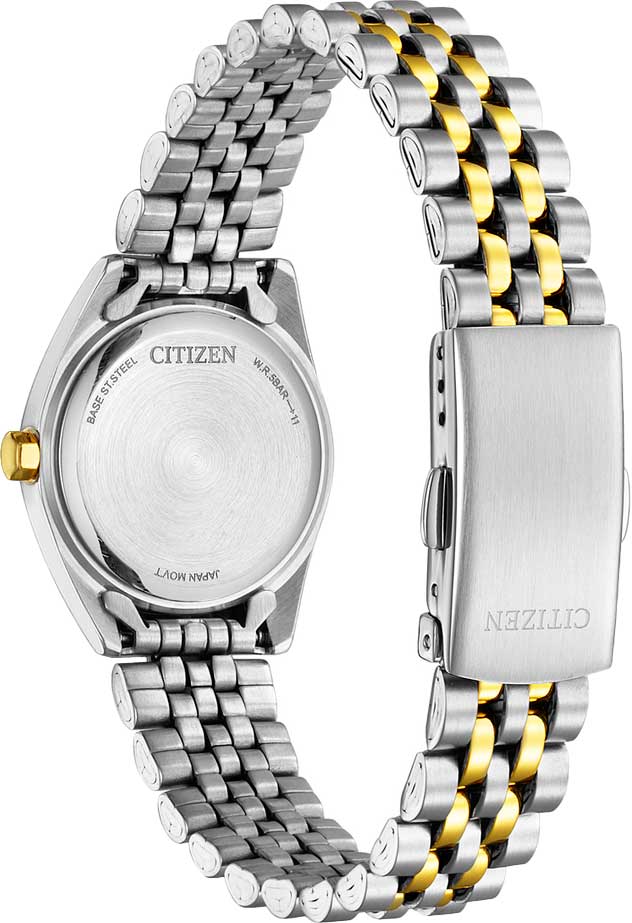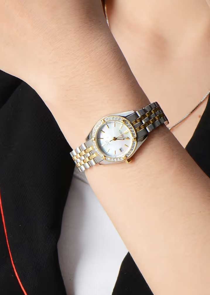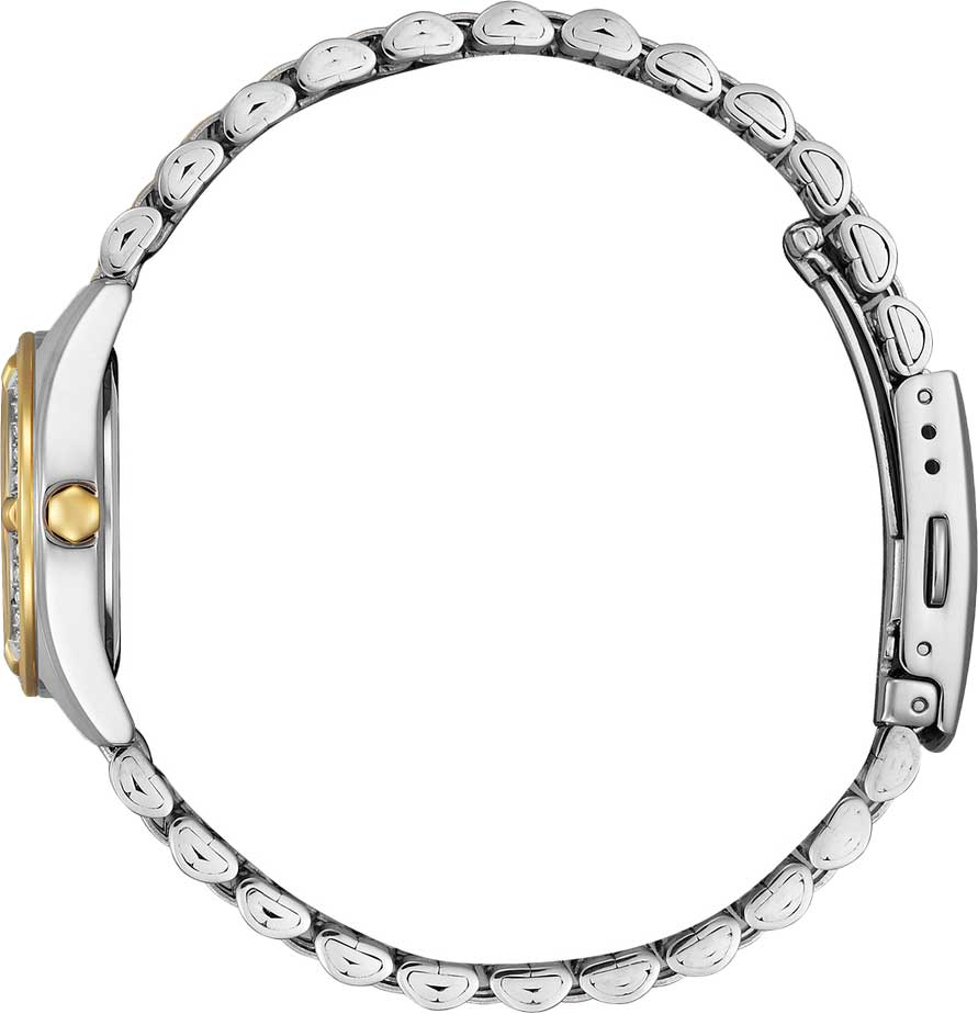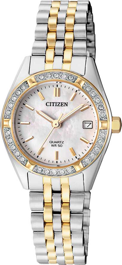 Женские часы с круглым стальным корпусом. Перламутровый циферблат с метками в виде штрихов. Окошко даты находится в положении 3 часа. Безель украшен паве из кристаллов. Браслет с раскладывающейся застежкой.