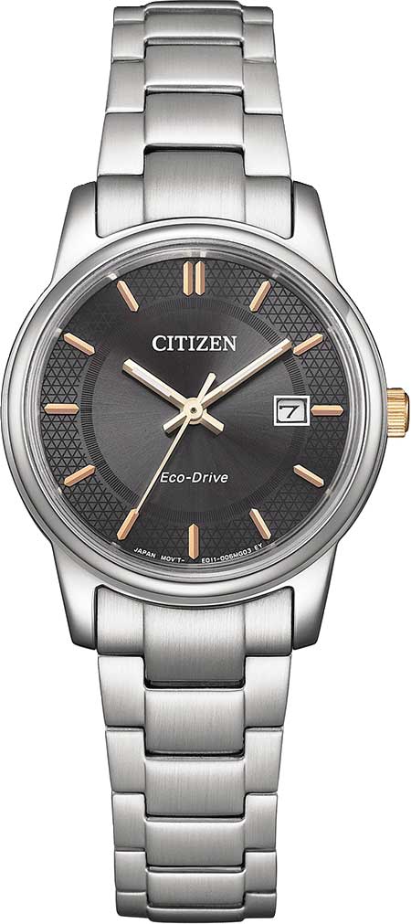 Женские часы. Система Eco-Drive, не требующая замены батарейки. Питание от солнечной энергии, запас энергии на 180 дней. Функция индикации заряда (EOL) и предотвращения перезарядки.