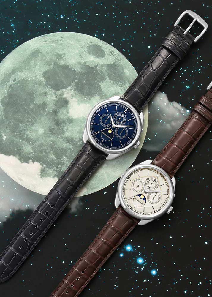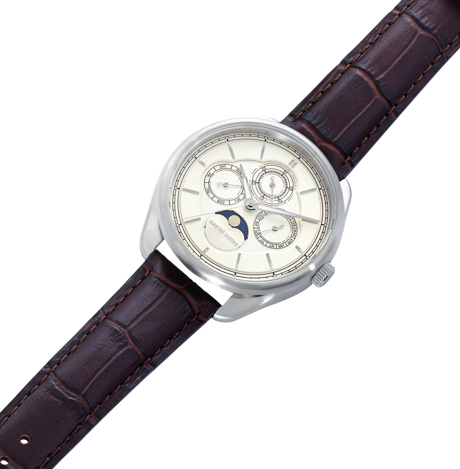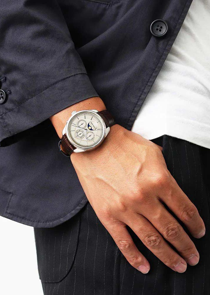 Мужские наручные часы. Круглый стальной корпус. Двухуровневый циферблат с метками в виде штрихов. Дата, день недели и месяц вынесены на отдельные циферблаты. Индикатор фазы луны в положении 6 часов. Рифленая заводная головка. Задняя крышка крепится на винтах. Ремешок из натуральной кожи с классической застежкой.