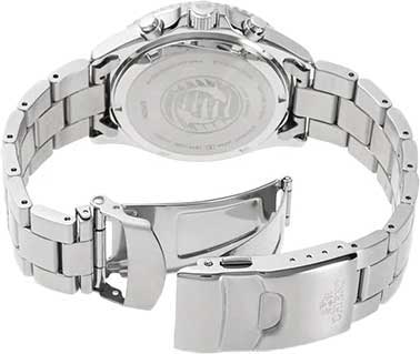 Питание от солнечной энергии. Запас хода при полном заряде батарейки составляет 6 месяцев. Часы-хронограф с секундомером. Секундомер с точностью 1с и временем измерения 60мин. 12-ти и 24-х часовой формат времени и секундная стрелка вынесены на отдельные циферблаты. Метки в виде штрихов и арабской цифры 12. Безель вращается на 120 щелчков в одном направлении. Окошко даты находится между отметками 4 и 5 часов. Завинчивающаяся заводная головка с защитой. Завинчивающаяся задняя крышка украшена гравировкой. Браслет с раскладывающейся застежкой. Застежка с системой блокировки.