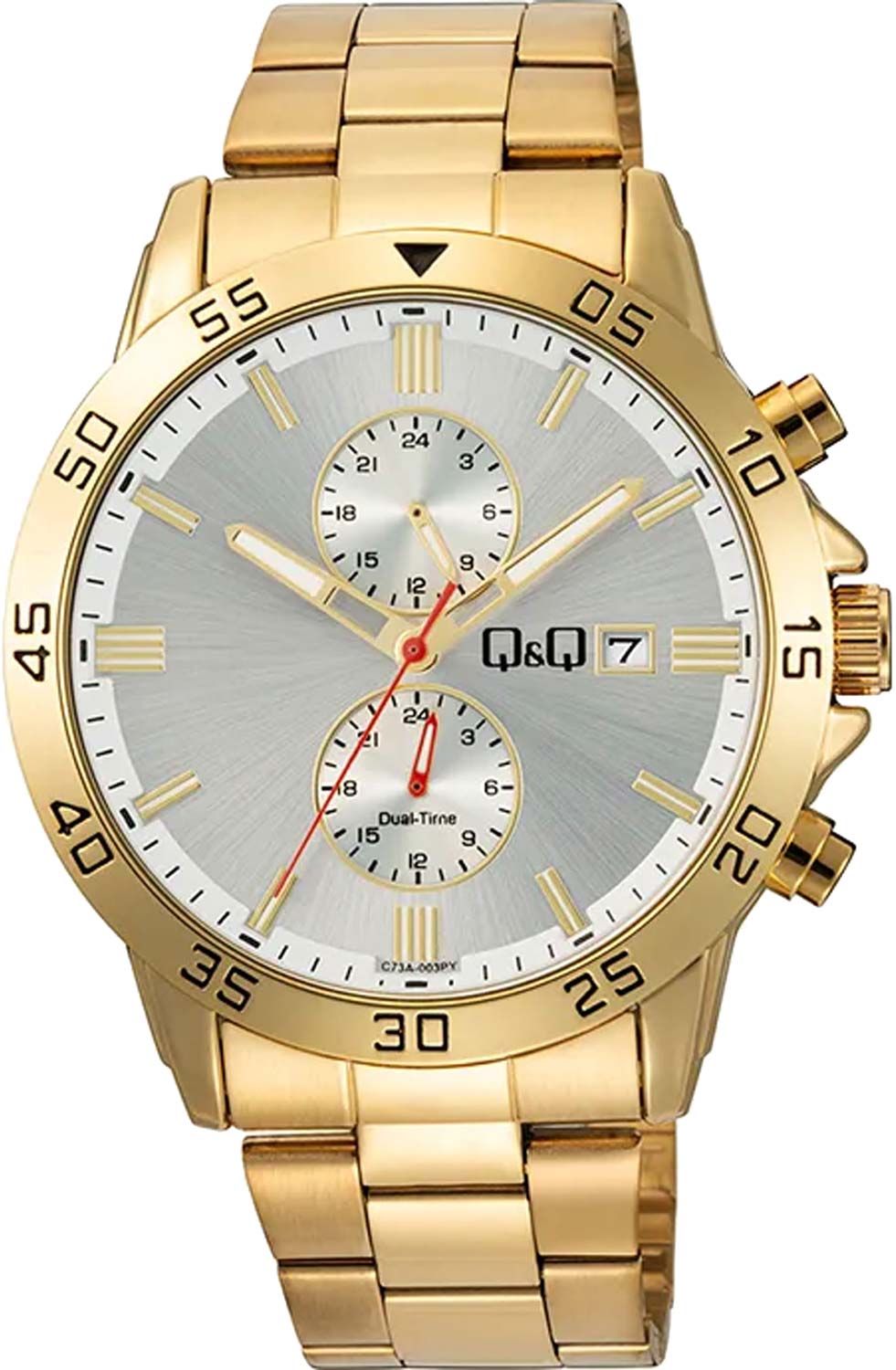 Мужские часы с круглым металлическим корпусом. 12-ти и 24-х часовой формат времени. Второй часовой пояс на дополнительном циферблате в положении 6 часов. Окошко даты находится на отметке 3 часа. Метки в виде штрихов. Безель с минутной шкалой. Рифленая заводная головка с защитой. Надежный металлический браслет с раскладывающейся застежкой.