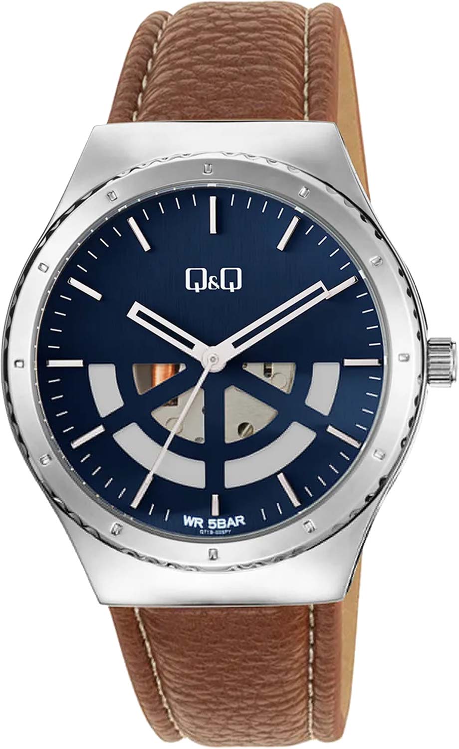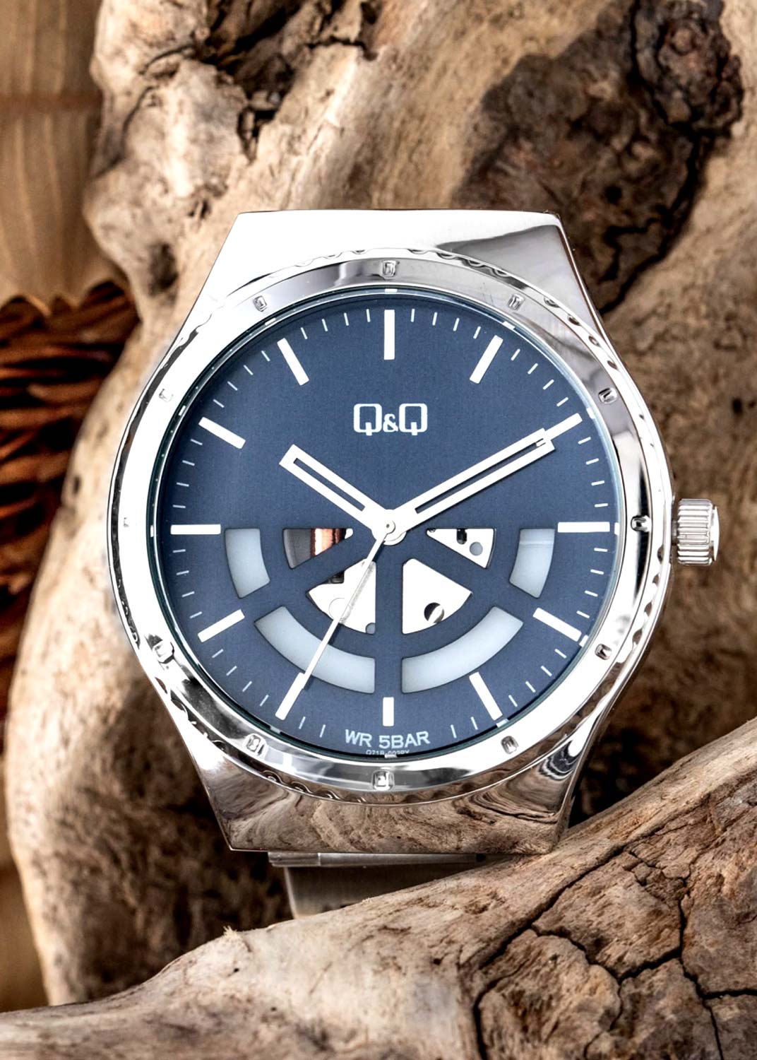 Мужские наручные часы. Круглый металлический корпус с минеральным стеклом. Рифленый безель. Циферблат с окошком, через которое видно механизм часов. Метки в виде штрихов. Рифленая заводная головка. Удобный ремешок из искусственной кожи с классической застежкой.