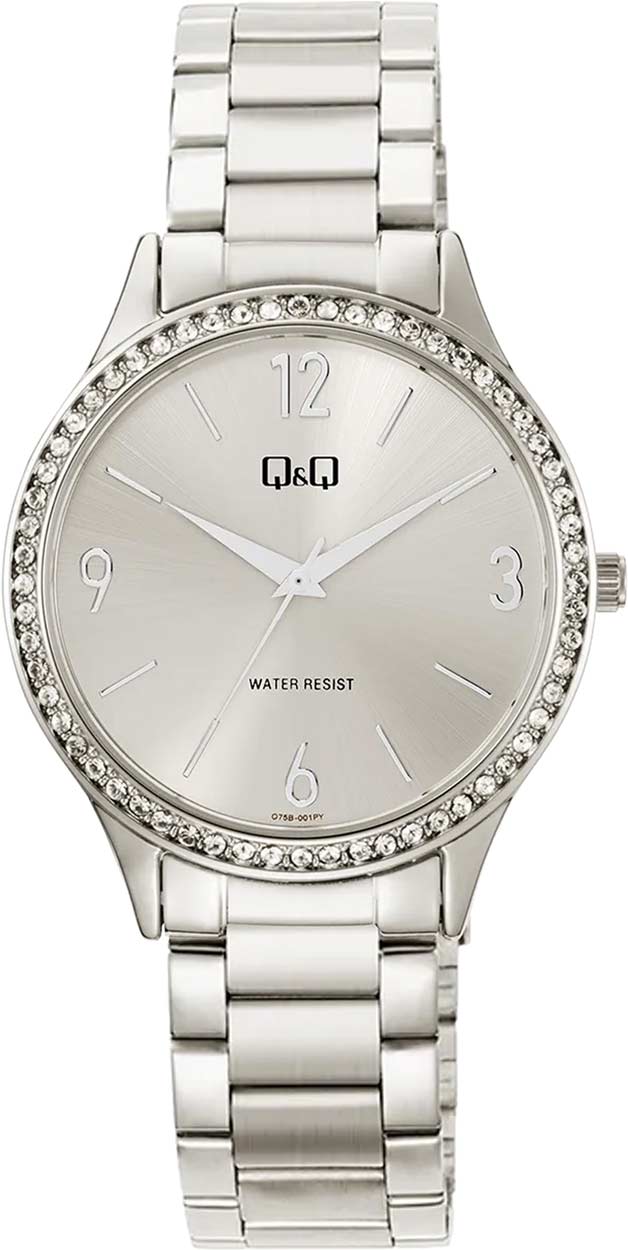 Женские наручные часы. Круглый металлический корпус с минеральным стеклом. Безель инкрустирован кристаллами. Циферблат выполнен по технологии Sunray (солнечные лучи). Метки в виде штрихов и арабских цифр. Рифленая заводная головка. Браслет с раскладывающейся застежкой.