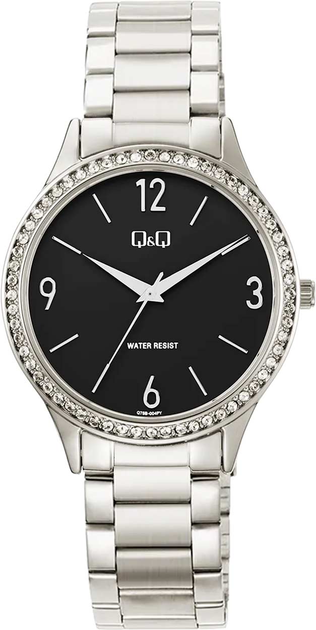 Женские наручные часы. Круглый металлический корпус с минеральным стеклом. Безель инкрустирован кристаллами. Циферблат с метками в виде штрихов и арабских цифр. Рифленая заводная головка. Браслет с раскладывающейся застежкой.