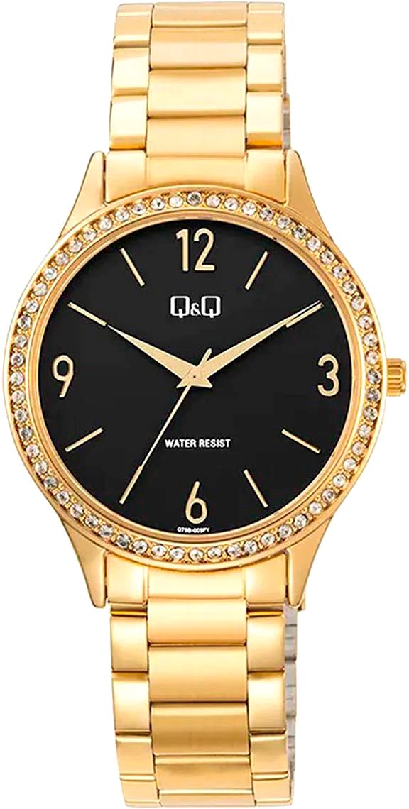 Наручные женские часы. Круглый металлический корпус c полированной поверхностью, украшенный кристаллами. Метки в виде штрихов и арабских цифр. Клиновидные стрелки в стиле Dauphine. Рифленая заводная головка. Надежный металлический браслет с раскладывающейся застежкой.