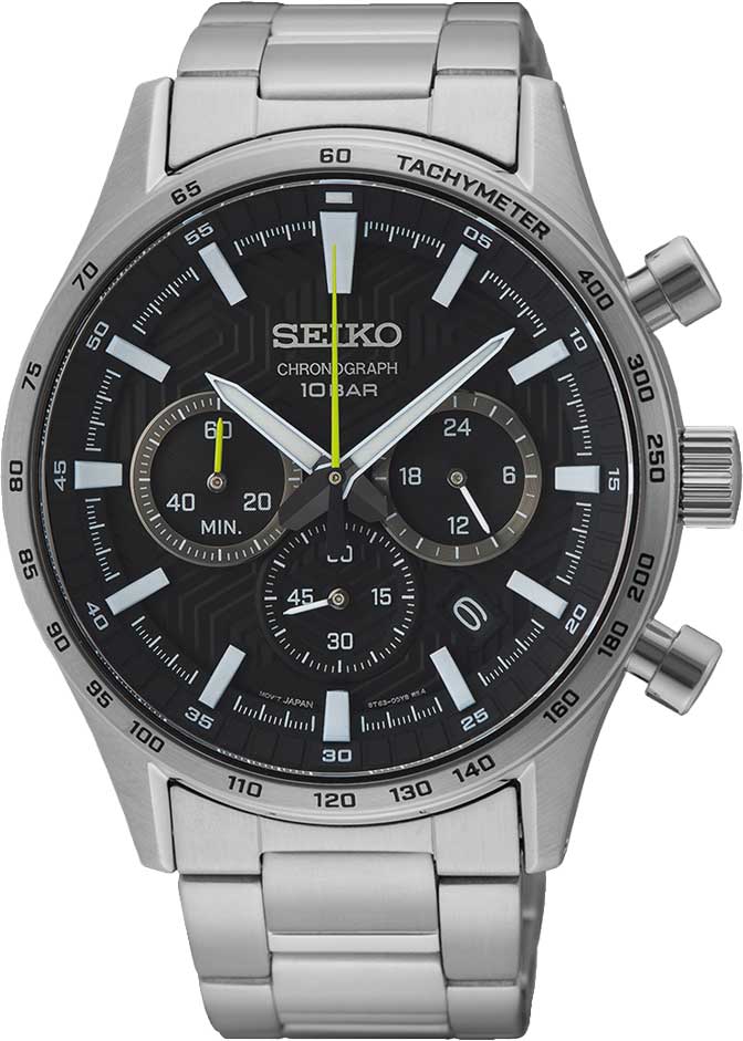 Discover More. Часы-хронограф с секундомером и тахиметром. Секундомер с точностью 1/5сек и временем измерения 1ч отображается центральной стрелкой. Секундная стрелка вынесена на отдельный циферблат. 12-ти и 24-х часовой формат времени. Двухуровневый циферблат с метками в виде штрихов защищен прочным сапфировым стеклом. Окошко даты находится между отметками 4 и 5 часов. Рифленая заводная головка. Завинчивающаяся задняя крышка. Надежный браслет с раскладывающейся застежкой.