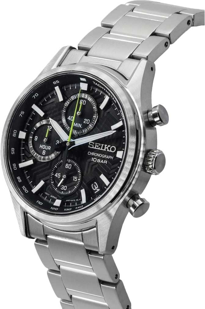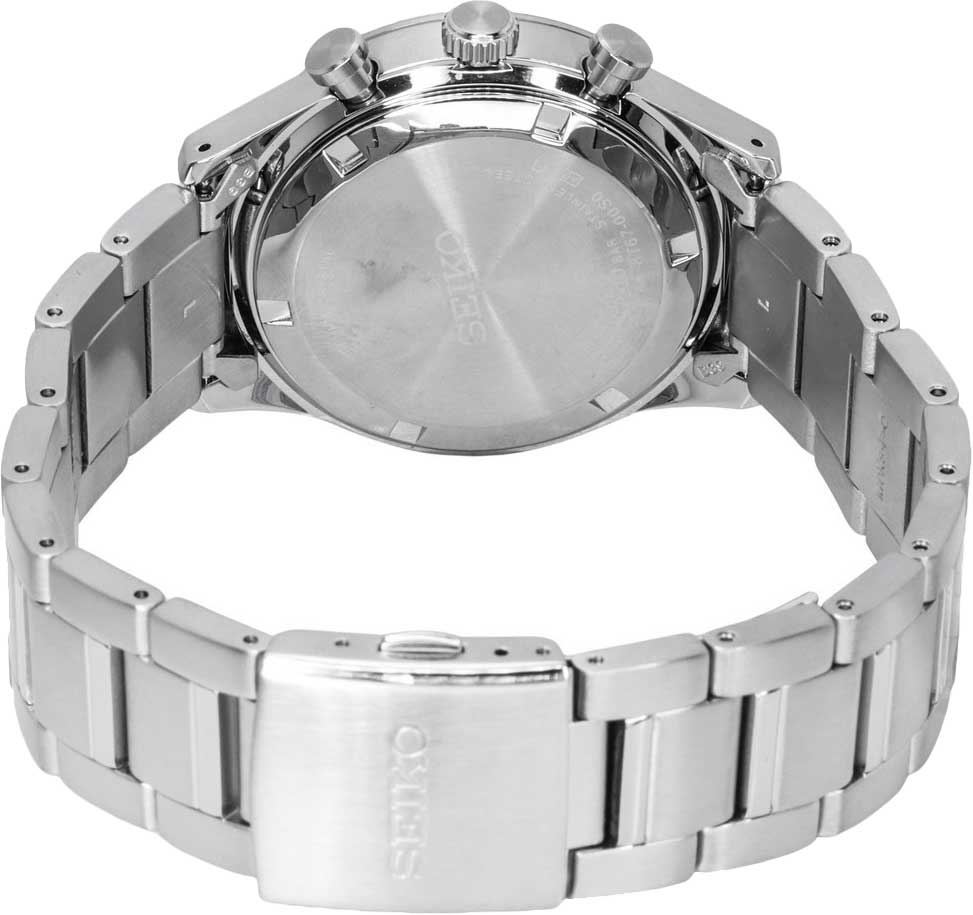Часы-хронограф с секундомером и тахиметром. Секундомер с точностью 1/5сек и временем измерения 12ч отображается центральной стрелкой. Защищены от магнитных полей (до 4800 А/м). Секундная стрелка вынесена на отдельный циферблат. Двухуровневый циферблат с метками в виде штрихов защищен прочным сапфировым стеклом. Окошко даты находится между отметками 4 и 5 часов. Рифленая заводная головка. Завинчивающаяся задняя крышка. Батарея рассчитана на 3 года. Надежный браслет с раскладывающейся застежкой.