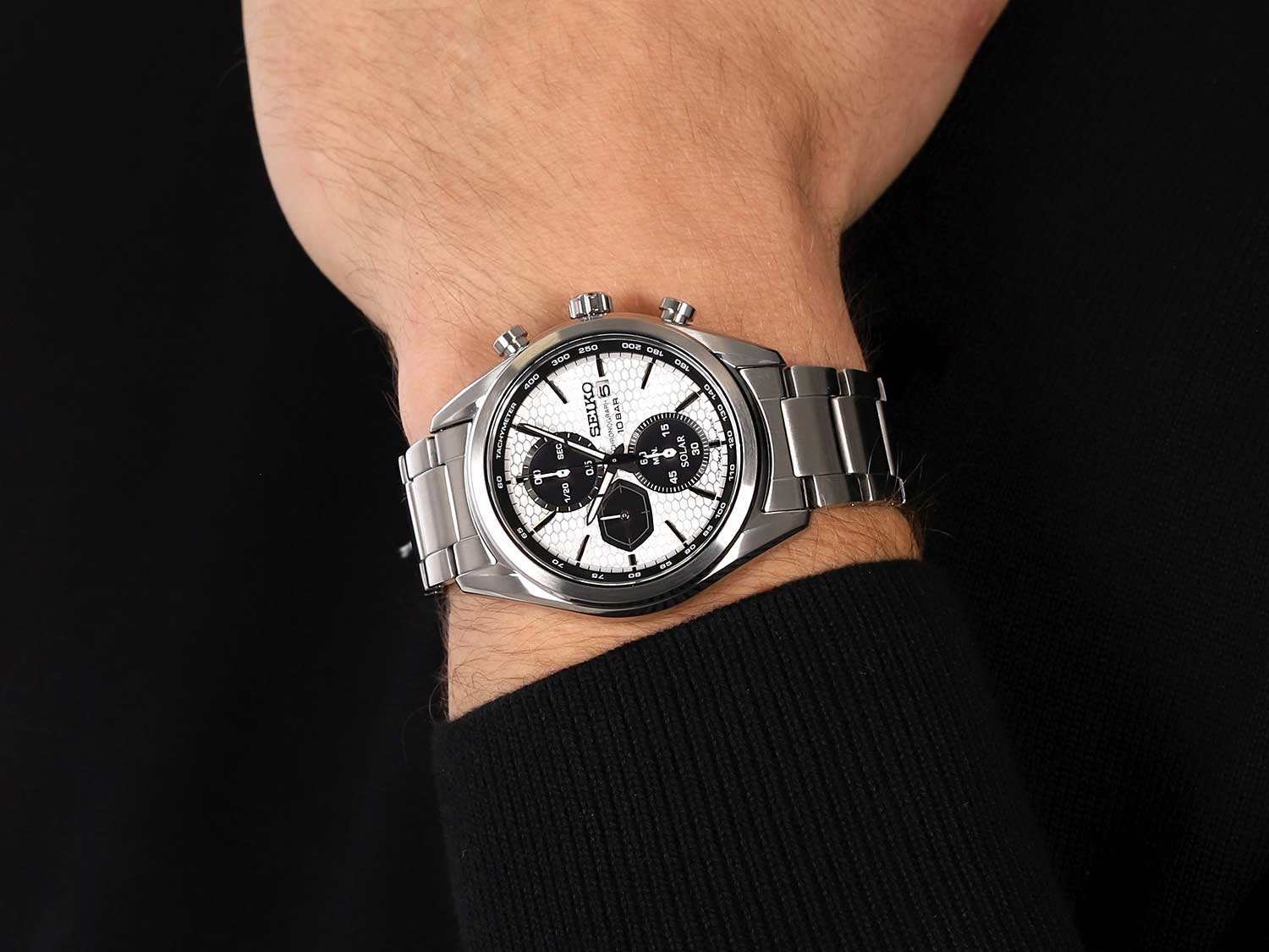Macchina Sportiva. Питание от солнечной энергии. Функция индикации заряда (EOL) и предотвращения перезарядки. Запас хода приблизительно 6 месяцев. Функция stop-second. Часы-хронограф с секундомером и тахиметром. Секундомер с точностью 1/20сек и временем измерения 1ч отображается центральной стрелкой. Секундная стрелка вынесена на отдельный циферблат. Циферблат с метками в виде штрихов. Окошко даты находится в положении 3 часа. Завинчивающаяся задняя крышка. Браслет с раскладывающейся застежкой.