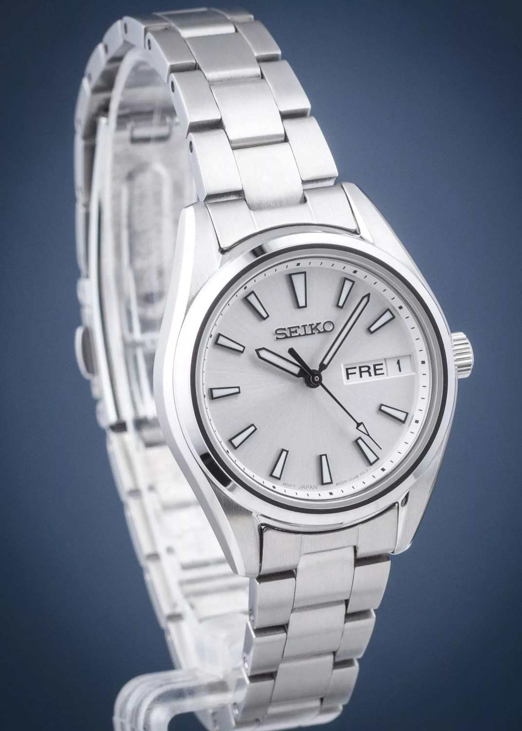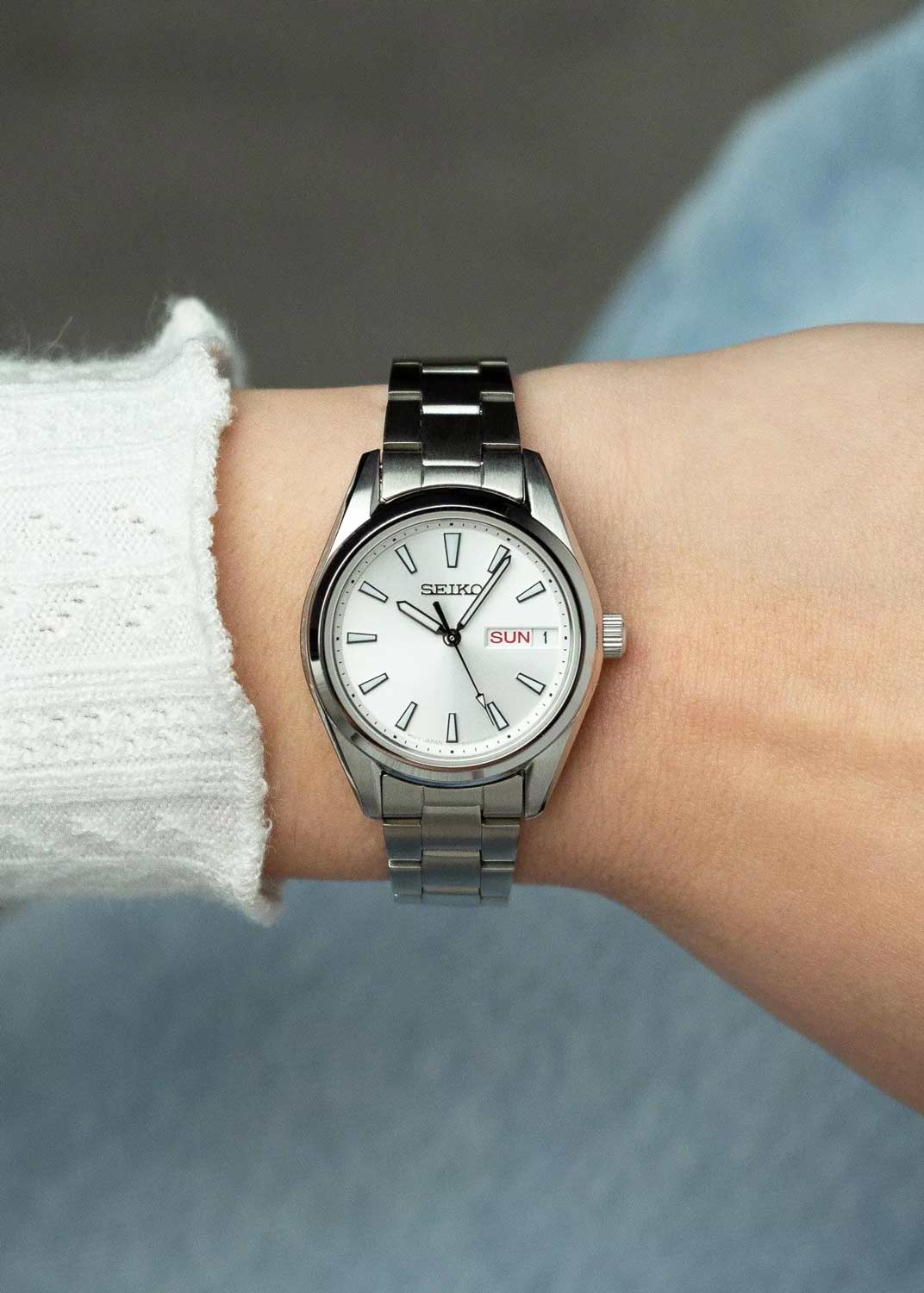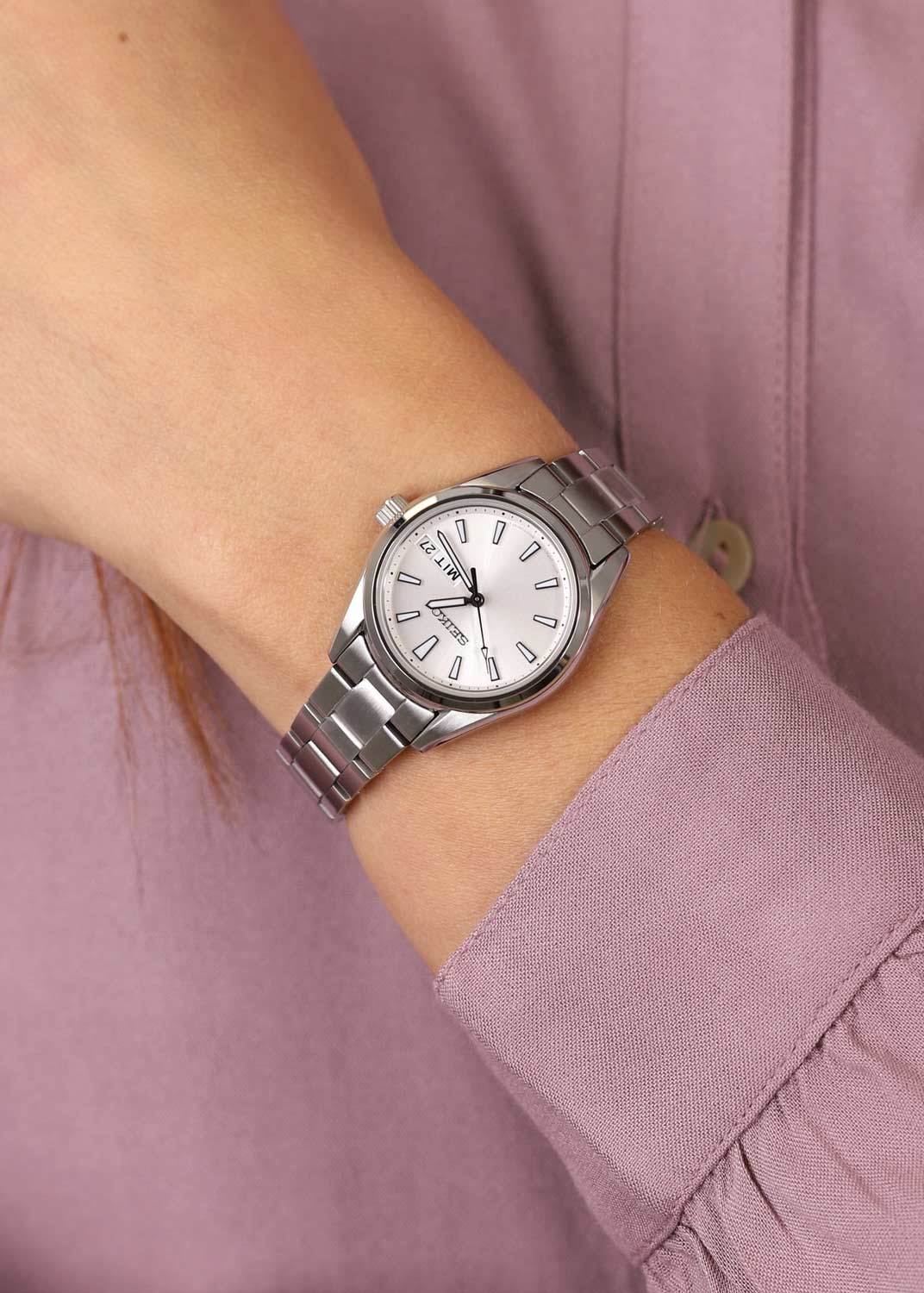 Классические женские наручные часы. Круглый стальной корпус. Циферблат выполнен по технологии Sunray (солнечные лучи). Стрелки и метки в виде штрихов с фирменным люминесцентным покрытием LumiBrite, которое светится в темноте после непродолжительной подзарядки на свету.