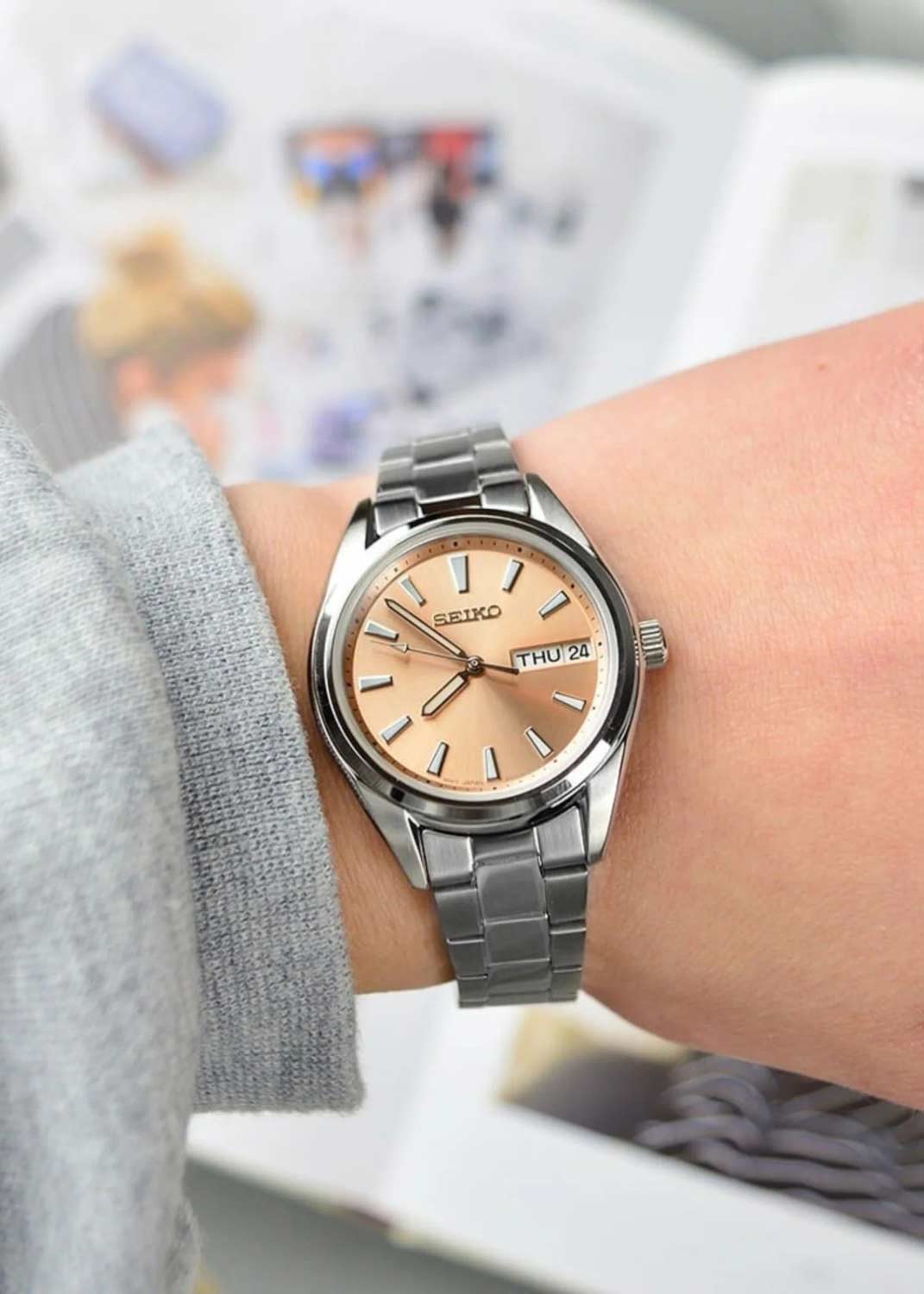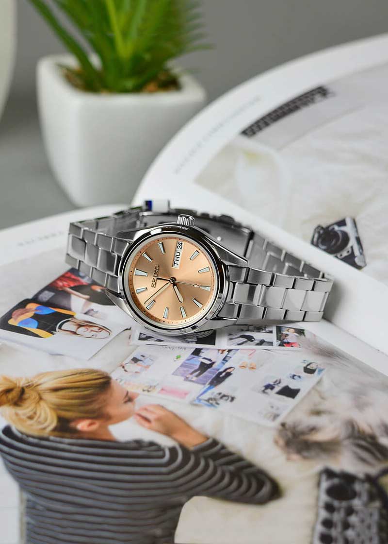 Классические женские наручные часы. Круглый стальной корпус. Циферблат выполнен по технологии Sunray (солнечные лучи). Стрелки и метки в виде штрихов с фирменным люминесцентным покрытием LumiBrite, которое светится в темноте после непродолжительной подзарядки на свету.