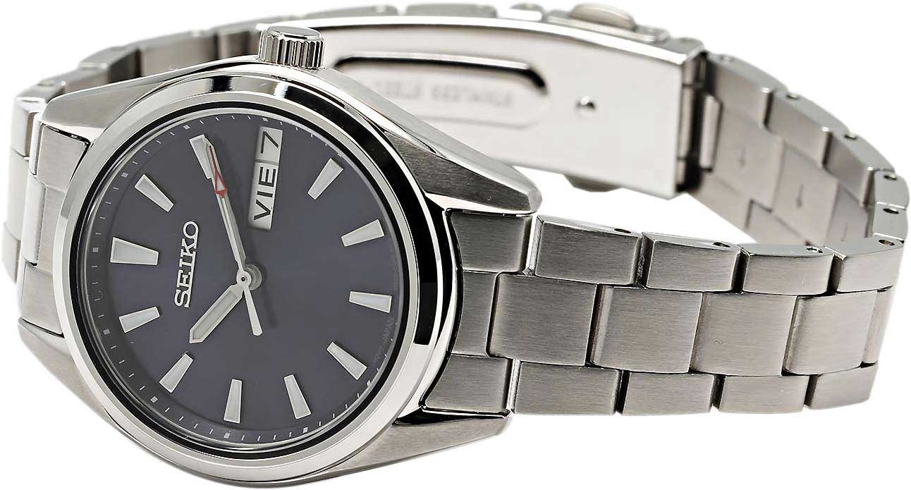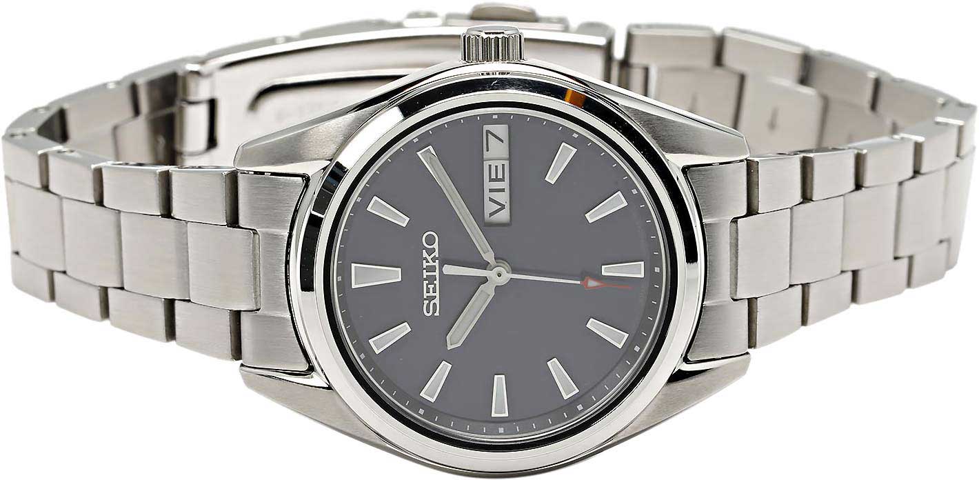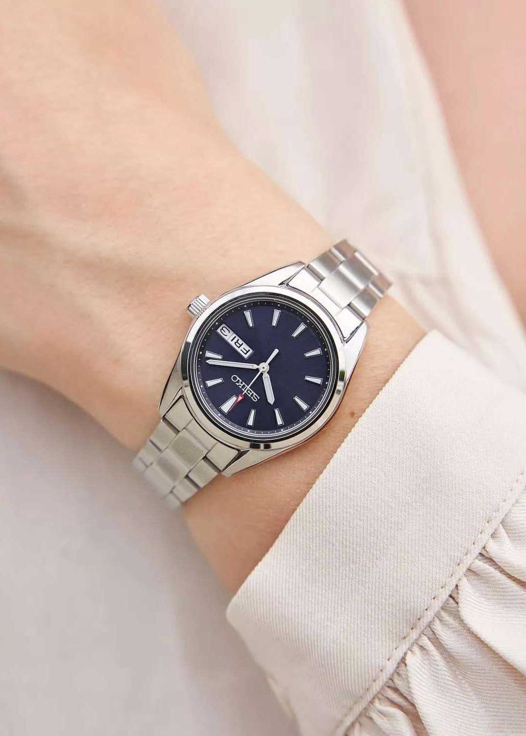 Окошко даты и дня недели находится в положении 3 часа. Рифленая заводная головка. Завинчивающаяся задняя крышка. Батарея рассчитана на 3 года. Браслет с раскладывающейся застежкой. Имеется мужской вариант модели SUR341.