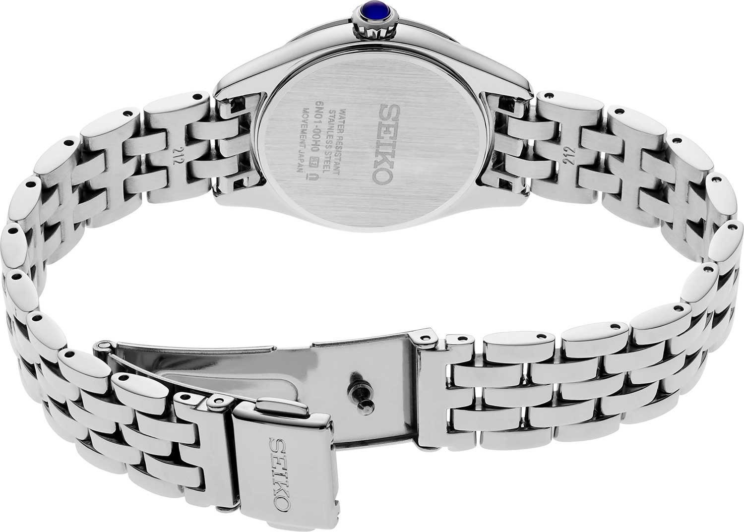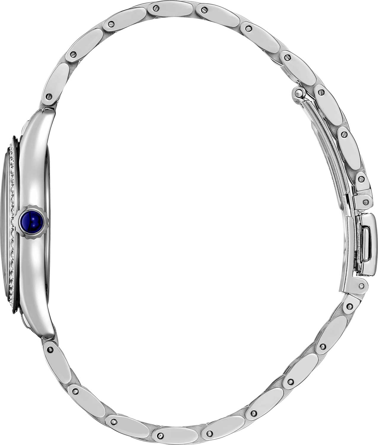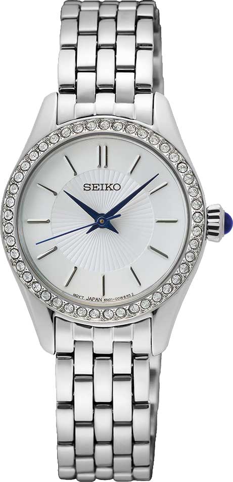 Discover More. Женские часы в круглом корпусе из нержавеющей стали. Защищены от магнитных полей (до 4800 А/м). Циферблат с метками в виде штрихов. Безель украшен паве из кристаллов. Рифленая заводная головка украшена камнем в форме кабошона. Батарея рассчитана на 3 года. Браслет с тройной раскладывающейся застежкой.