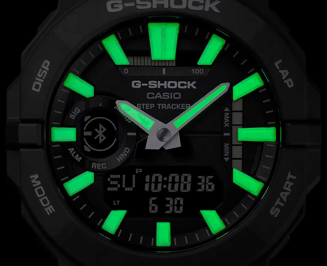 Двойная подcветка: циферблат и ЖК-дисплеи подсвечиваются светодиодом, благодаря наличию функции задержки, после отпускания кнопки освещение горит еще несколько секунд. Настраиваемое послесвечение 1,5 или 3сек. Цвет подсветки: белый. Необритовое светонакопительное покрытие обеспечивает длительное послесвечение в темноте даже после кратковременного нахождения на свету.