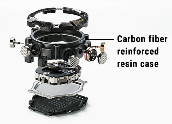 состоит из трех слоев тонкого пластика со вставкой из углеродного волокна. Верхний слой прозрачный, в результате чего видно карбоновую прослойку. Двойная задняя крышка: стальная закрывает механизм, а поверх неё закреплена пластина из ударопрочного тонкого пластика.