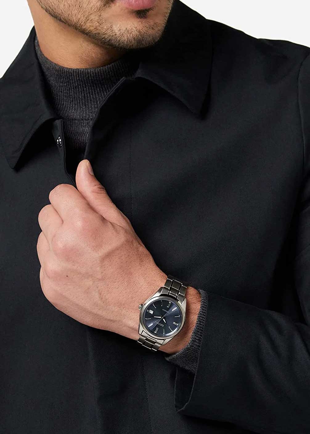 Мужские часы с круглым титановым корпусом. Циферблат выполнен по технологии Sunray (солнечные лучи) и защищен прочным сапфировым стеклом. Метки в виде штрихов. Стрелки и метки с фирменным люминесцентным покрытием LumiBrite, которое светится в темноте после непродолжительной подзарядки на свету.